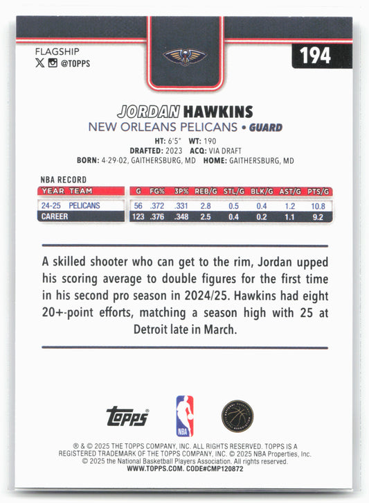 This is a nice example of a 2025-26 Topps #194 Jordan Hawkins Other important information about this card:In 2025 Jordan Hawkins played for the New Orleans Pelicans.Please check out our...