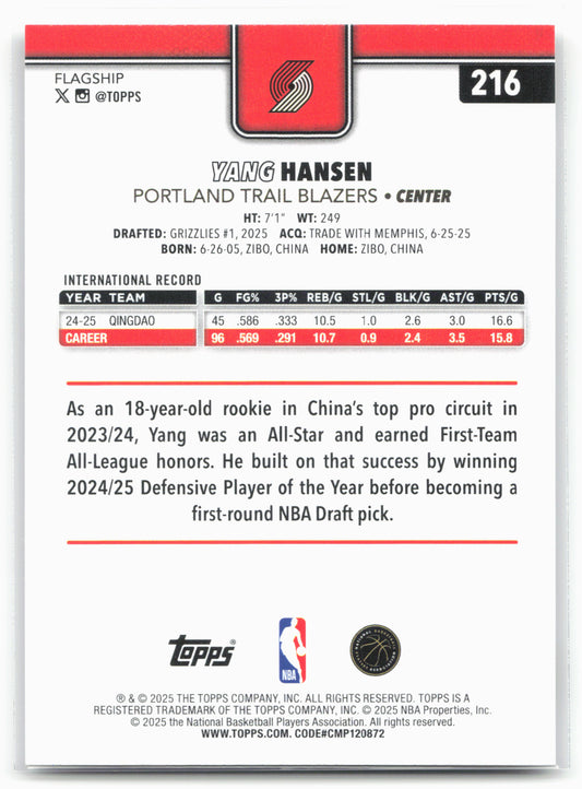 This is a nice example of a 2025-26 Topps #216 Yang Hansen Other important information about this card:RCIn 2025 Yang Hansen played for the Portland Trail Blazers.Please check out our...