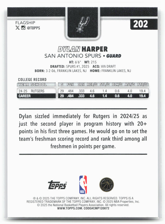 This is a nice example of a 2025-26 Topps #202 Dylan Harper Other important information about this card:RCIn 2025 Dylan Harper played for the San Antonio Spurs.Please check out our...