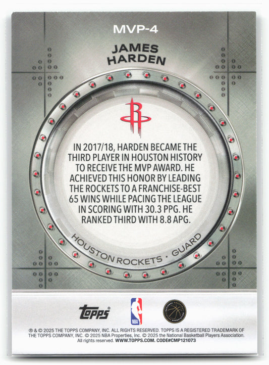 This is a nice example of a 2025-26 Topps #MVP-4 James Harden MVP Vault Rainbow Foilboard Other important information about this card:In 2025 James Harden played for the Houston Rockets.Please...