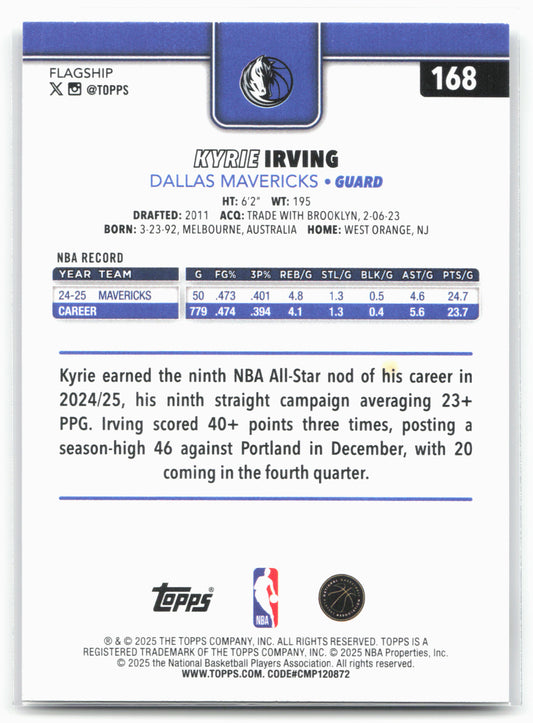 This is a nice example of a 2025-26 Topps #168 Kyrie Irving Other important information about this card:In 2025 Kyrie Irving played for the Dallas Mavericks.Please check out our other...
