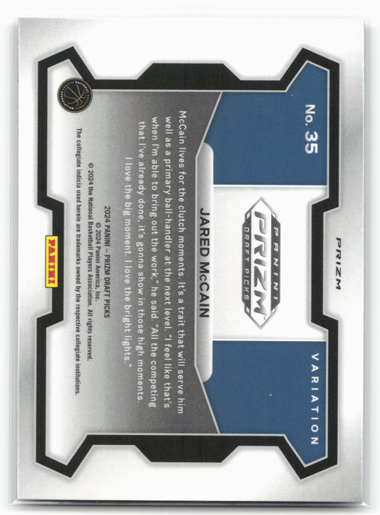 This is a nice example of a 2024 Panini Prizm Draft Picks #35b Jared McCain Prizms Purple Wave Other important information about this card:In 2024 Jared McCain played for the...