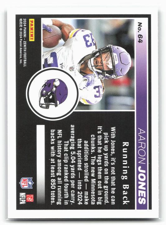 This is a nice example of a 2024 Panini Zenith #64 Aaron Jones Retail Other important information about this card:In 2024 Aaron Jones played for the Minnesota Vikings.Please check out...