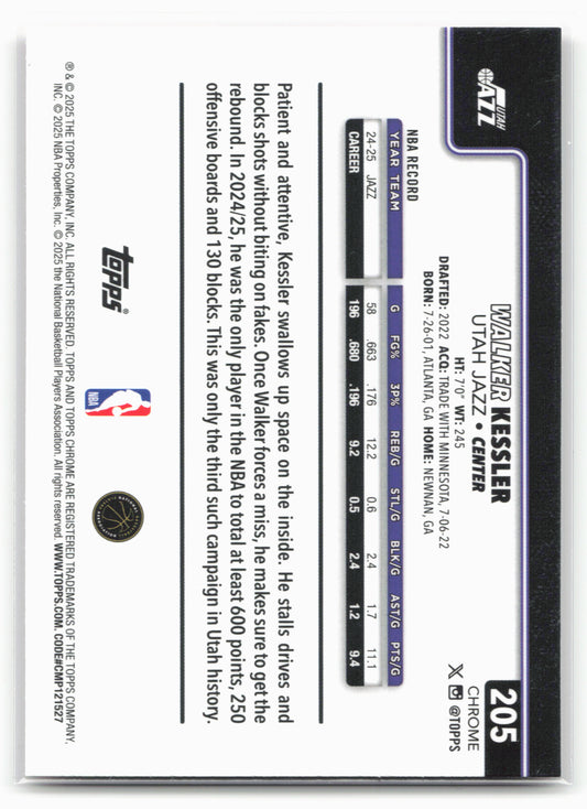 This is a nice example of a 2025-26 Topps Chrome #205 Walker Kessler Refractors Magenta /399 Other important information about this card:In 2025 Walker Kessler played for the Utah Jazz.Please...