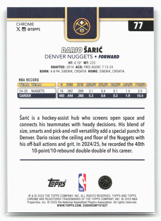 This is a nice example of a 2025-26 Topps Chrome #77 Dario Šarić X-Fractors Other important information about this card:In 2025 Dario Šarić played for the Denver Nuggets.Please check out...