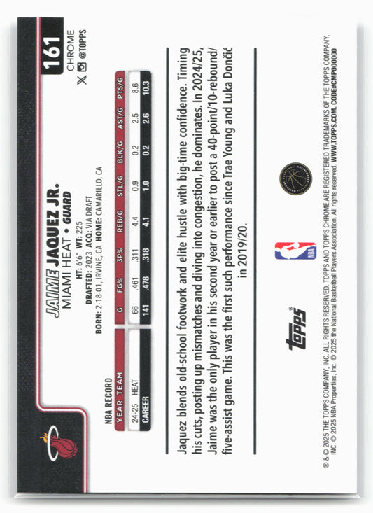 This is a nice example of a 2025-26 Topps Chrome #161 Jaime Jaquez Jr. X-Fractors Other important information about this card:In 2025 Jaime Jaquez Jr. played for the Miami Heat.Please...