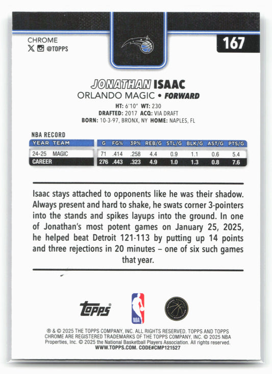 This is a nice example of a 2025-26 Topps Chrome #167 Jonathan Isaac X-Fractors Other important information about this card:In 2025 Jonathan Isaac played for the Orlando Magic.Please check out...