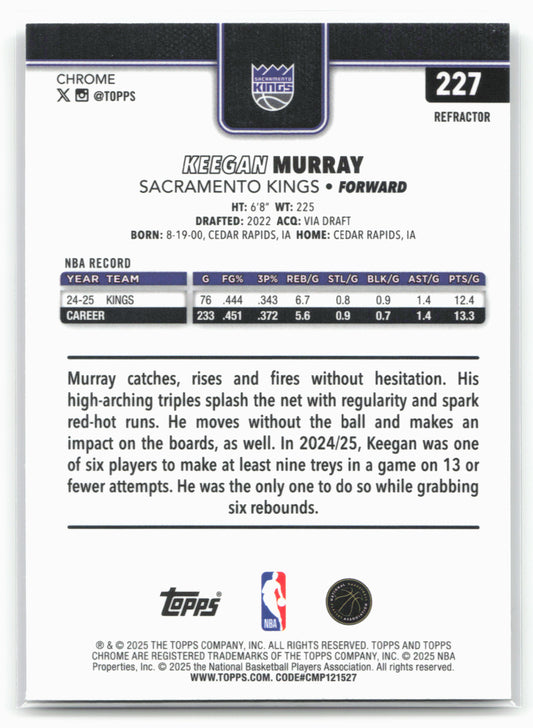 This is a nice example of a 2025-26 Topps Chrome #227 Keegan Murray Prism Refractors Other important information about this card:In 2025 Keegan Murray played for the Sacramento Kings.Please check...