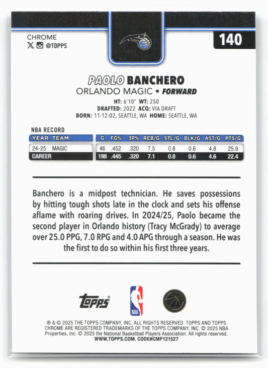 This is a nice example of a 2025-26 Topps Chrome #140 Paolo Banchero Prism Refractors Other important information about this card:In 2025 Paolo Banchero played for the Orlando Magic.Please check...