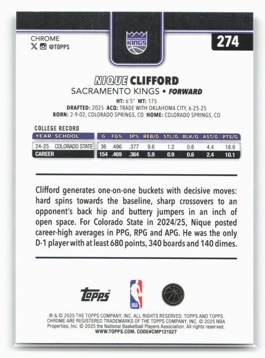 This is a nice example of a 2025-26 Topps Chrome #274 Nique Clifford X-Fractors Other important information about this card:RCIn 2025 Nique Clifford played for the Sacramento Kings.Please check out...