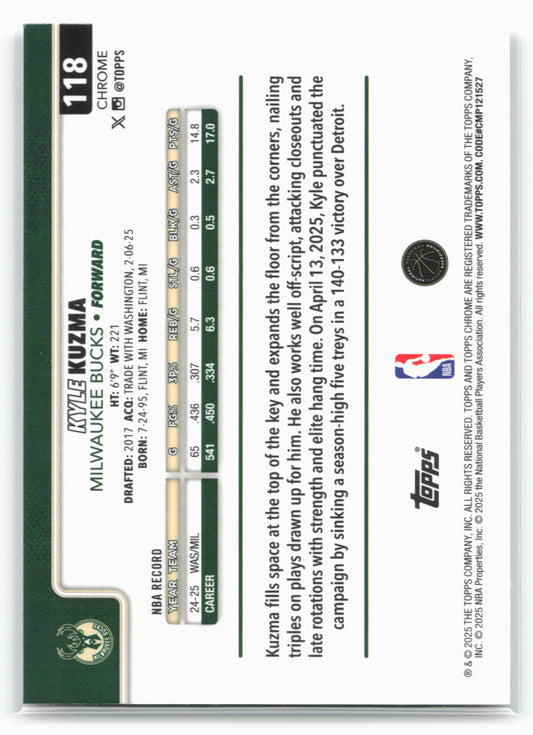 This is a nice example of a 2025-26 Topps Chrome #118 Kyle Kuzma RayWave Refractors Other important information about this card:In 2025 Kyle Kuzma played for the Milwaukee Bucks.Please check...