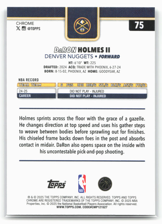 This is a nice example of a 2025-26 Topps Chrome #75 DaRon Holmes II X-Fractors Other important information about this card:In 2025 DaRon Holmes II played for the Denver Nuggets.Please...