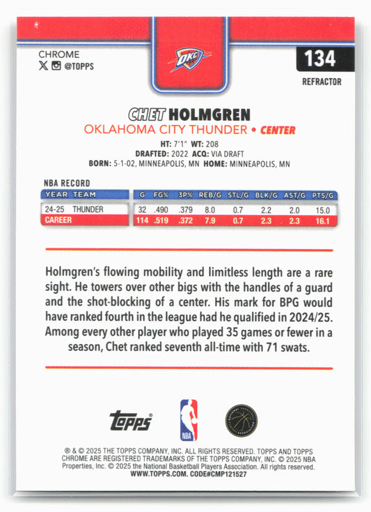 This is a nice example of a 2025-26 Topps Chrome #134 Chet Holmgren Refractors Other important information about this card:In 2025 Chet Holmgren played for the Oklahoma City Thunder.Please check...
