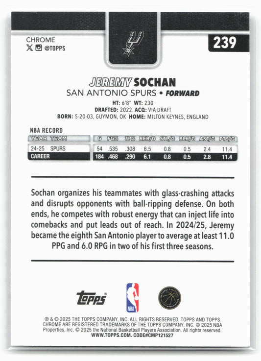This is a nice example of a 2025-26 Topps Chrome #239 Jeremy Sochan X-Factor Other important information about this card:In 2025 Jeremy Sochan played for the San Antonio Spurs.Please check...