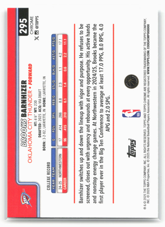 This is a nice example of a 2025-26 Topps Chrome #295 Brooks Barnhizer RayWave Refractors Other important information about this card:RCIn 2025 Brooks Barnhizer played for the Oklahoma City Thunder.Please...