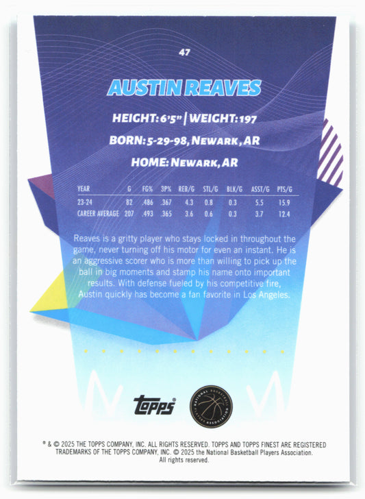 This is a nice example of a 2024-25 Finest #47 Austin Reaves Sky Blue Refractor Other important information about this card:23160In 2024 Austin Reaves played for the Los Angeles Lakers.Please...