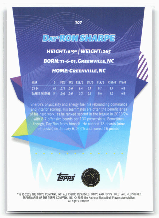 This is a nice example of a 2024-25 Finest #107 Day'Ron Sharpe Purple X-Fractor Other important information about this card:SNIn 2024 Day'Ron Sharpe played for the Brooklyn Nets.Please check out...
