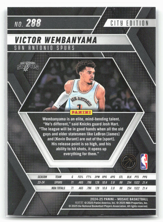 This is a nice example of a 2024-25 Panini Mosaic #288 Victor Wembanyama Other important information about this card:23174In 2024 Victor Wembanyama played for the San Antonio Spurs.Please check out...