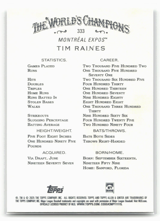 This is a nice example of a 2025 Topps Allen & Ginter #333 Tim Raines Other important information about this card:In 2025 Tim Raines played for the Montreal Expos.Please check...