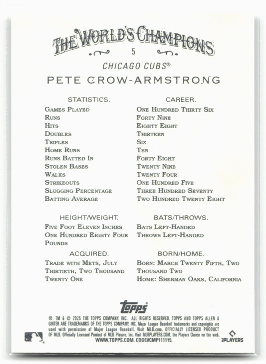 This is a nice example of a 2025 Topps Allen & Ginter #5 Pete Crow-Armstrong Other important information about this card:In 2025 Pete Crow-Armstrong played for the Chicago Cubs.Please check...