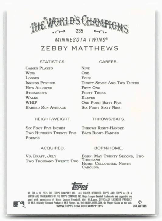 This is a nice example of a 2025 Topps Allen & Ginter #235 Zebby Matthews Other important information about this card:RCIn 2025 Zebby Matthews played for the Minnesota Twins.Please check...