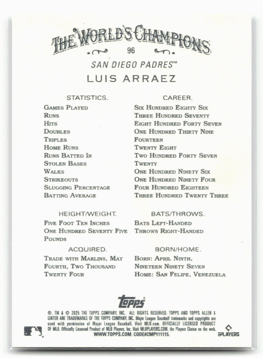 This is a nice example of a 2025 Topps Allen & Ginter #96 Luis Arraez Other important information about this card:In 2025 Luis Arraez played for the San Diego Padres.Please...