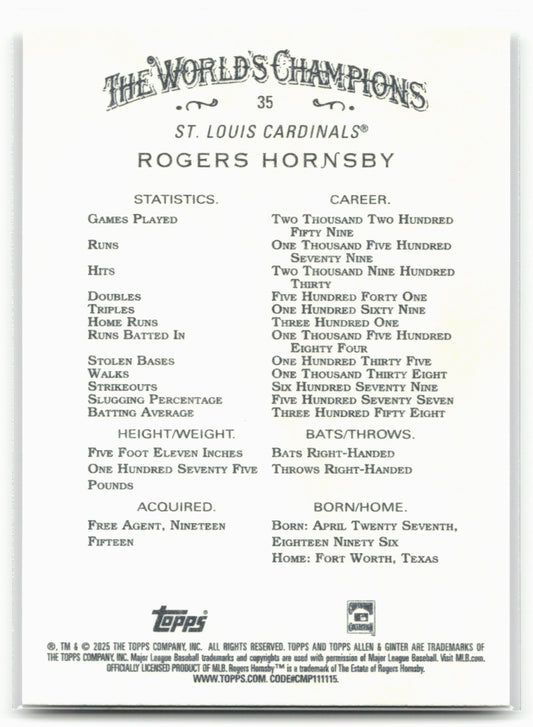 This is a nice example of a 2025 Topps Allen & Ginter #35 Rogers Hornsby Other important information about this card:In 2025 Rogers Hornsby played for the St. Louis Cardinals.Please...