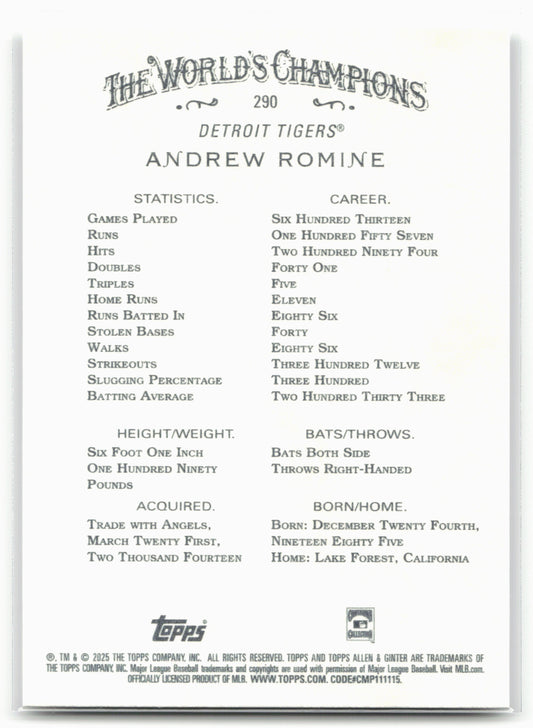 This is a nice example of a 2025 Topps Allen & Ginter #290 Andrew Romine Other important information about this card:In 2025 Andrew Romine played for the Detroit Tigers.Please check...