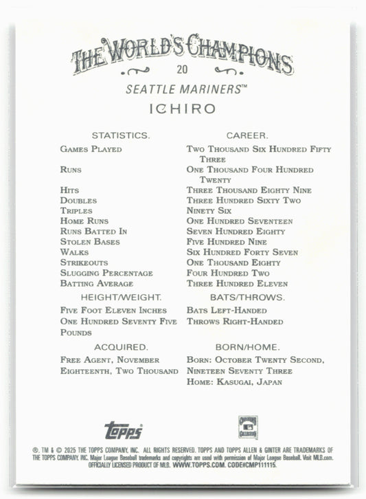 This is a nice example of a 2025 Topps Allen & Ginter #20 Ichiro Other important information about this card:In 2025 Ichiro played for the Seattle Mariners.Please check out our...