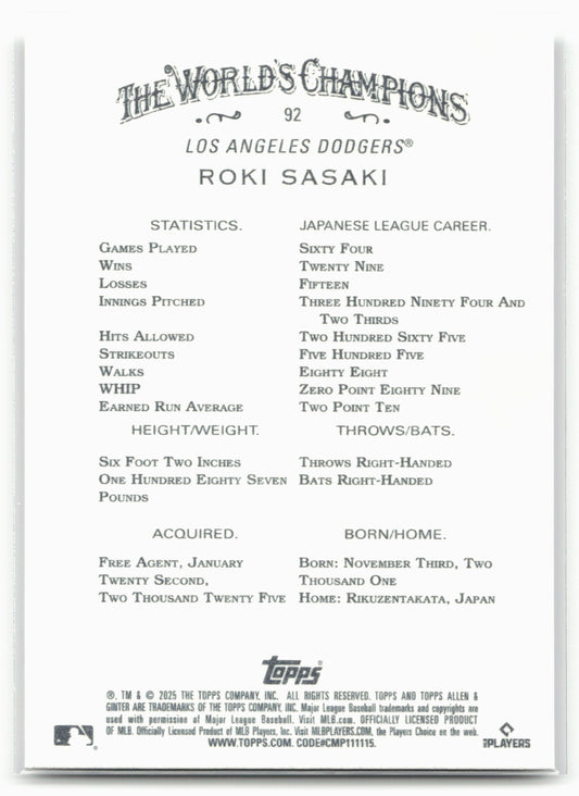 This is a nice example of a 2025 Topps Allen & Ginter #92 Roki Sasaki Other important information about this card:RCIn 2025 Roki Sasaki played for the Los Angeles Dodgers.Please...