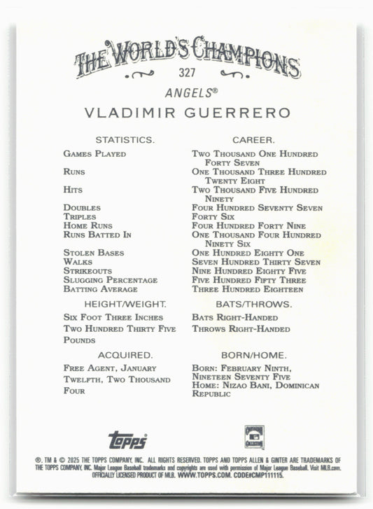 This is a nice example of a 2025 Topps Allen & Ginter #327 Vladimir Guerrero Other important information about this card:In 2025 Vladimir Guerrero played for the Los Angeles Angels.Please...
