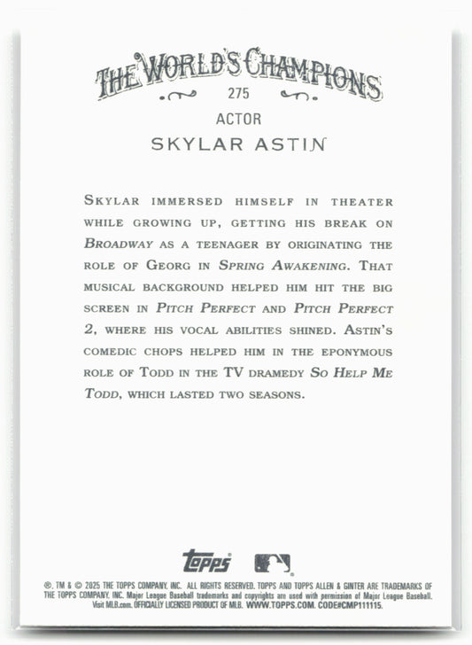 This is a nice example of a 2025 Topps Allen & Ginter #275 Skylar Astin Other important information about this card:In 2025 Skylar Astin played for the MLB.Please check out...