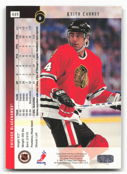 This is a nice example of a 1994-95 Upper Deck #449 Keith Carney Other important information about this card:In 1994 Keith Carney played for the Chicago Blackhawks.Please check out our...
