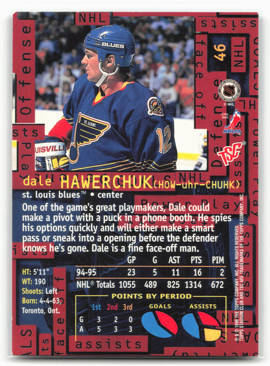 This is a nice example of a 1995-96 Stadium Club #46 Dale Hawerchuk Other important information about this card:In 1995 Dale Hawerchuk played for the St. Louis Blues.Please check out...