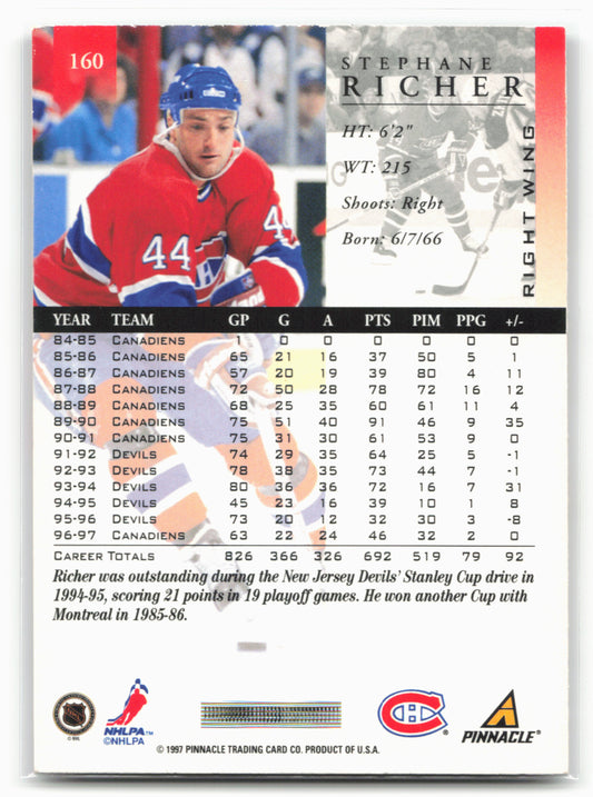 This is a nice example of a 1997-98 Pinnacle #160 Stephane Richer Other important information about this card:In 1997 Stephane Richer played for the Montreal Canadiens.Please check out our other...