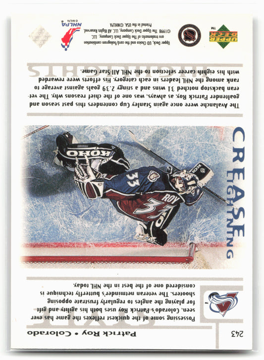 This is a nice example of a 1998-99 UD Choice #243 Patrick Roy Other important information about this card:In 1998 Patrick Roy played for the Colorado Avalanche.Please check out our...