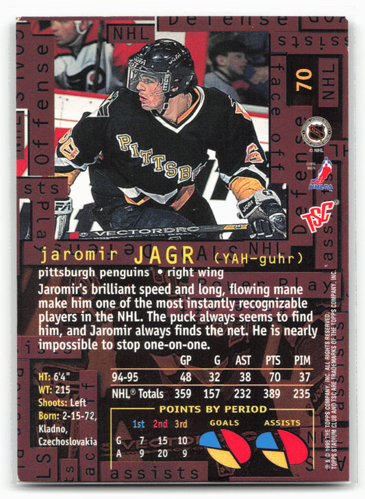 This is a nice example of a 1995-96 Stadium Club #70 Jaromir Jagr Other important information about this card:In 1995 Jaromir Jagr played for the Pittsburgh Penguins.Please check out our...