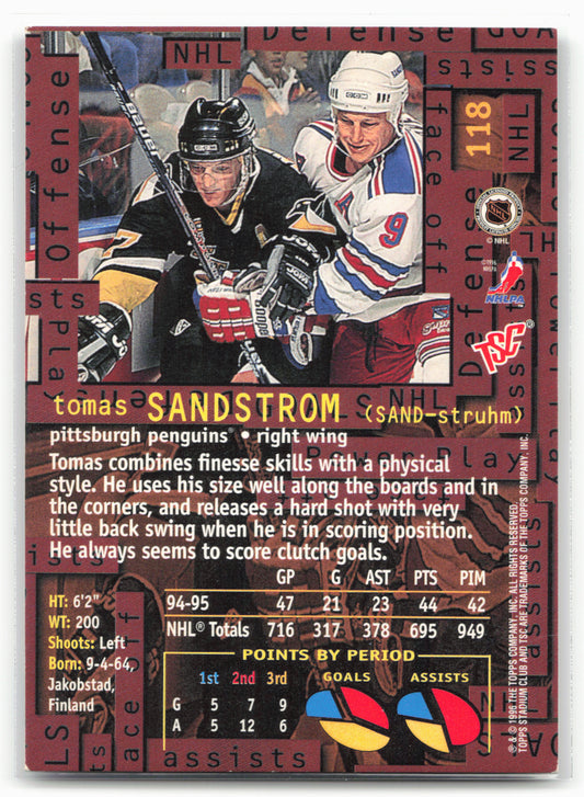 This is a nice example of a 1995-96 Stadium Club #118 Tomas Sandstrom Other important information about this card:In 1995 Tomas Sandstrom played for the Pittsburgh Penguins.Please check out our...
