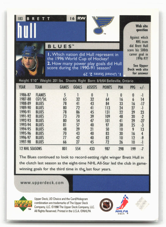This is a nice example of a 1998-99 UD Choice #183 Brett Hull Other important information about this card:In 1998 Brett Hull played for the St. Louis Blues.Please check out...