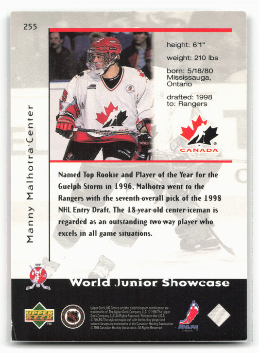 This is a nice example of a 1998-99 UD Choice #255 Manny Malhotra Other important information about this card:In 1998 Manny Malhotra played for the Canada.Please check out our other...