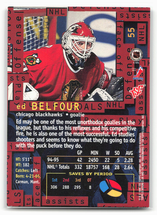 This is a nice example of a 1995-96 Stadium Club #55 Ed Belfour Other important information about this card:In 1995 Ed Belfour played for the Chicago Blackhawks.Please check out our...