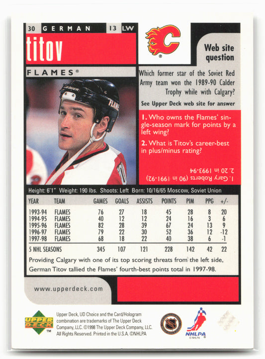 This is a nice example of a 1998-99 UD Choice #30 German Titov Other important information about this card:In 1998 German Titov played for the Calgary Flames.Please check out our...