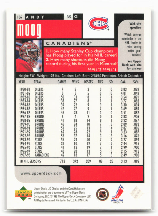 This is a nice example of a 1998-99 UD Choice #106 Andy Moog Other important information about this card:In 1998 Andy Moog played for the Montreal Canadiens.Please check out our...