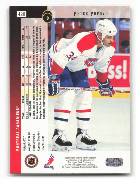 This is a nice example of a 1994-95 Upper Deck #428 Peter Popovic Electric Ice Other important information about this card:In 1994 Peter Popovic played for the Montreal Canadiens.Please check...
