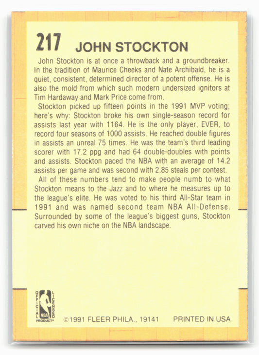 This is a nice example of a 1991-92 Fleer #217 John Stockton Other important information about this card:24744In 1991 John Stockton played for the Utah Jazz.Please check out our other...