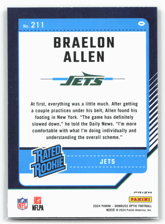 This is a nice example of a 2024 Donruss Optic #211 Braelon Allen Purple Shock Other important information about this card:In 2024 Braelon Allen played for the New York Jets.Please...