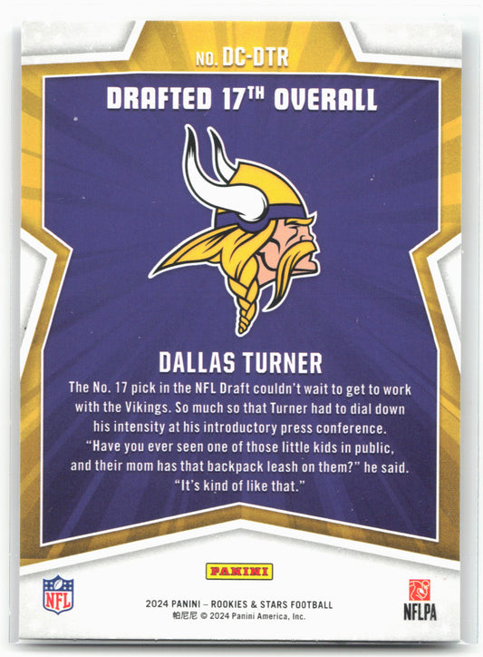 This is a nice example of a 2024 Panini Rookies & Stars #DC-DTR Dallas Turner Draft Class Other important information about this card:In 2024 Dallas Turner played for the Minnesota...