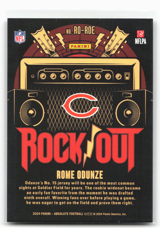 This is a nice example of a 2024 Panini Absolute #RO-ROE Rome Odunze Rock Out Other important information about this card:In 2024 Rome Odunze played for the Chicago Bears.Please check...