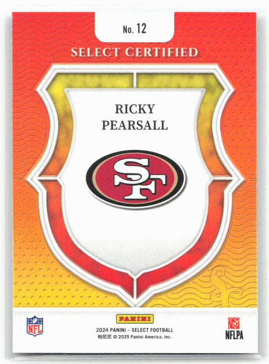 This is a nice example of a 2024 Panini Select #12 Ricky Pearsall Select Certified Rookies Other important information about this card:In 2024 Ricky Pearsall played for the San Francisco...