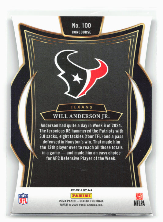 This is a nice example of a 2024 Panini Select #100 Will Anderson Jr. Silver Prizm Die Cut Other important information about this card:In 2024 Will Anderson Jr. played for...